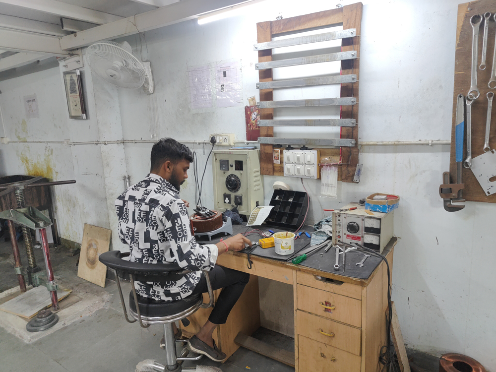• Technician operating a servo stabilizer test bench (variac + meters)